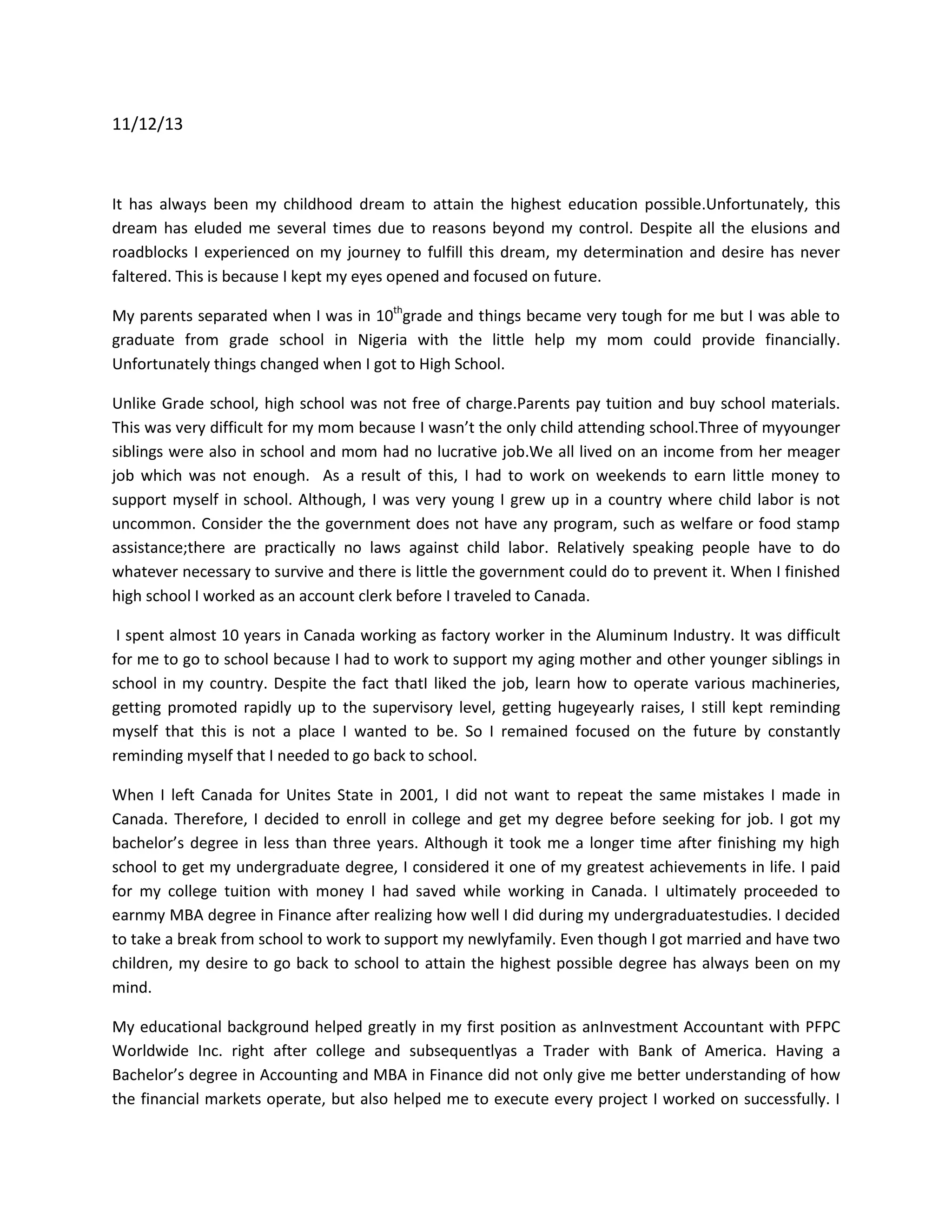 The document discusses the author's lifelong dream of attaining the highest level of education despite facing many obstacles. As a child in Nigeria, the author had to work to support their education after their parents separated. They spent 10 years working in Canada to support their family before obtaining bachelor's and MBA degrees in the United States. Their education helped them get promoted quickly in finance roles. After being laid off in 2009, the author decided to pursue a Doctorate in Business Administration to further their career and achieve their dream of the highest education.