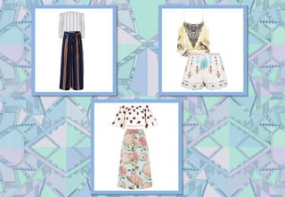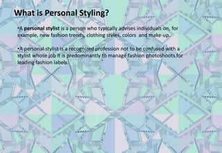 This document provides information about personal styling and different body types. It discusses the roles of a personal stylist and different body shapes including triangle, inverted triangle, diamond, oval, and rectangle. For each body shape, it provides examples of flattering dressy, casual, and formal outfits. It also includes sections on self-image, color analysis, makeup tips, wardrobe organization, and fashion trends.