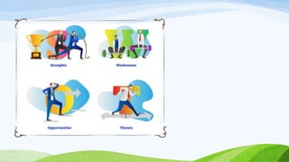 SWOT analysis is a strategic planning tool that assesses a business's internal strengths and weaknesses, as well as external opportunities and threats. It helps individuals and organizations identify areas for improvement and formulate strategies based on these factors. The document outlines specific examples of strengths, weaknesses, opportunities, and threats relevant to personal and organizational contexts.