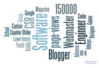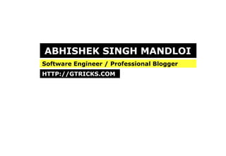 Abhishek Singh Mandloi works as a software engineer and professional blogger, maintaining a blog that receives approximately 150,000 page views per month and generating over 50% of his salary. He has worked at Infosys for 29 months in application development, debugging, problem analysis, and UI/UX and front-end design. Abhishek has received several academic and professional achievements including scoring a perfect 5.0 CGPA in Infosys training and winning an award for dedication to his work.
