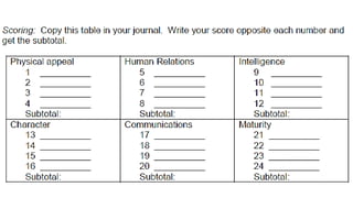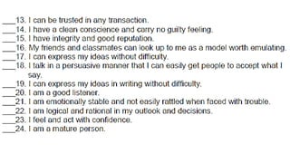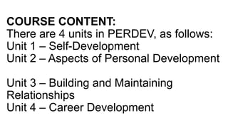 The document outlines a personal development course consisting of four units focused on self-development, aspects of personal development, building relationships, and career development. It emphasizes self-awareness, personal effectiveness, and the importance of journaling to reflect on one's life, strengths, and goals. Various activities and criteria for tasks are provided to foster personal growth and encourage proactive engagement in one's life journey.