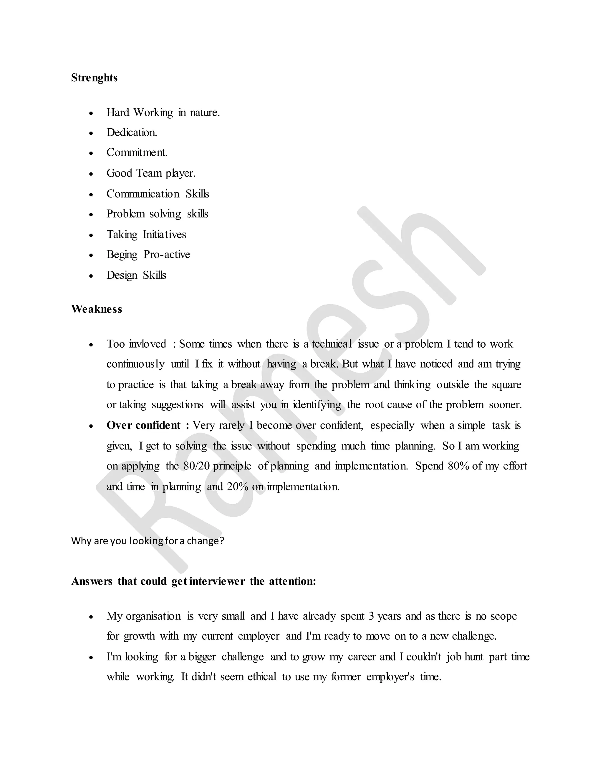 The document outlines strengths, weaknesses, and common interview questions and answers for a job applicant. It describes the applicant's strengths as being hard working, dedicated, a good communicator and problem solver. One weakness is getting too involved in problems without taking breaks. Common interview questions covered include reasons for seeking a new position or change, why the employer should hire the applicant, handling pressure, and factors contributing to the applicant's success.