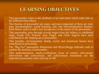 The document discusses theories of personality development. It describes Freud's psychosexual stages of development including the oral, anal, phallic, latency, and genital stages. It also describes Erik Erikson's eight stages of psychosocial development from infancy to late adulthood. The document also discusses determinants of personality such as heredity, environment, family and social factors. It covers personality traits theories including the 'Big Five' model and how personality influences behavior and performance.