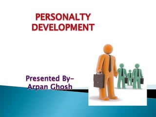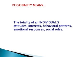 This document discusses the concept of personality and provides definitions. Personality encompasses an individual's attitudes, interests, behaviors, emotions, and social roles. It also lists several aspects of personality like public speaking, food habits, body language, behavior, anger management, physical fitness, relationship skills, and learning skills. The document discusses the difference between perception and reality. It outlines some negative emotions like superiority complex, inferiority complex, fear, and stress. It provides tips to overcome these negative emotions. Finally, it discusses the concepts of positive attitude, internal strengths vs external weaknesses, and opportunities vs threats.
