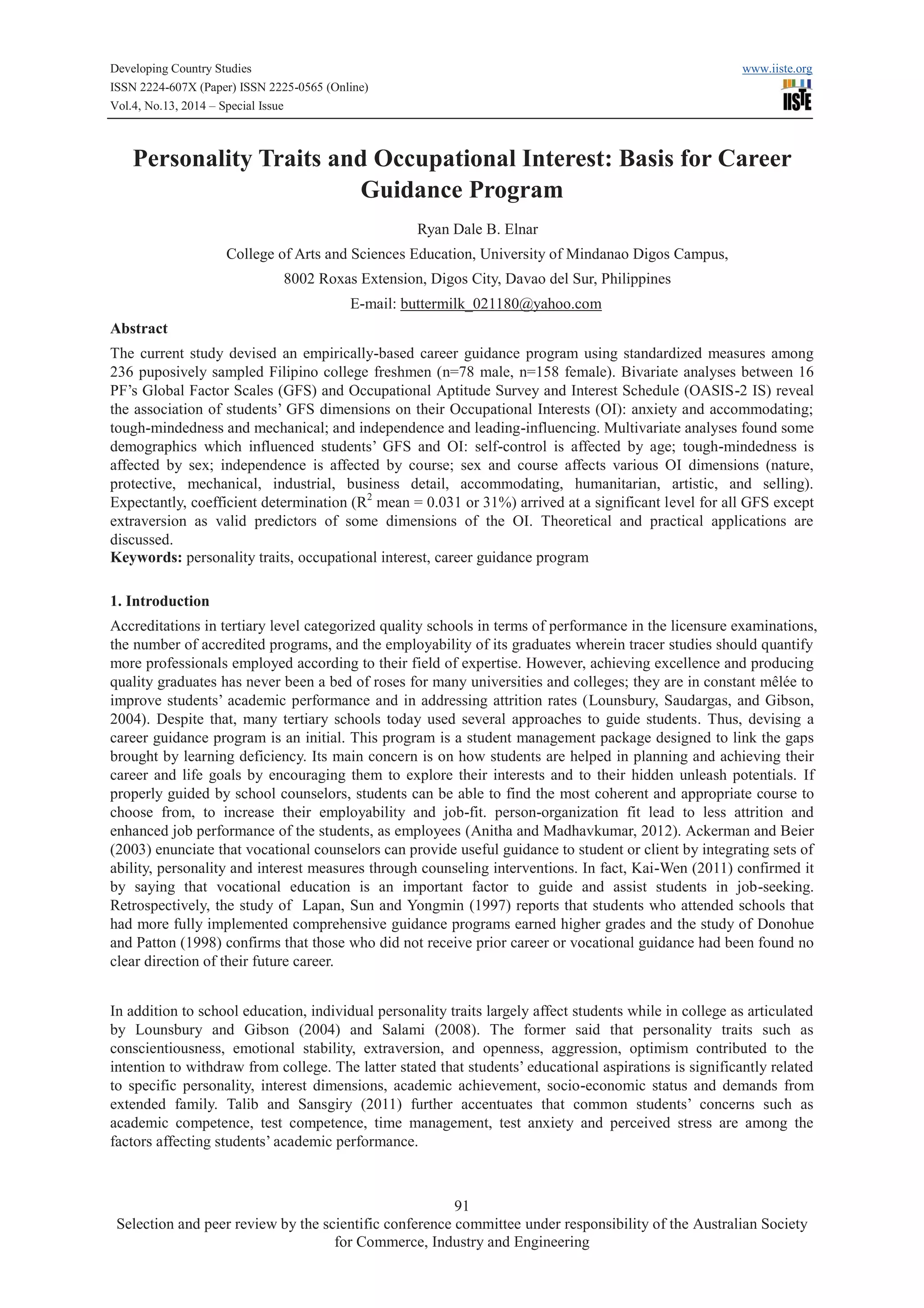 The study developed a career guidance program for 236 Filipino college freshmen, analyzing the relationship between their personality traits and occupational interests. Bivariate and multivariate analyses revealed significant correlations between dimensions of personality traits and occupational interests, influenced by demographics such as age, sex, and course of study. Findings highlighted the importance of tailored career guidance to enhance student employability and job satisfaction.