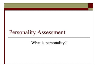 Personality assessments can help counselors understand individual behavior, determine appropriate courses of action, and predict future behavior. Personality includes traits, states, and types. Traits are consistent dimensions of individual differences while states are temporary tendencies. Types describe a person generally, such as introverted or extroverted. Structured personality inventories like the MMPI-2 and MCMI-III use standardized questions while projective tests like the Rorschach and TAT use ambiguous stimuli to project unconscious feelings. Personality assessments provide insight into clients but rely on the interpreter's judgment.