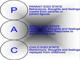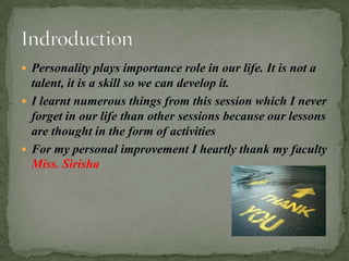 The document discusses personality development and time management. It defines personality and describes 16 personality types. It also covers factors important for developing personality like perception, learning, rationality, empathy and persistence. The document then discusses time management, describing it as planning, allocating time, setting goals, and prioritizing. It notes that without proper time management, one can experience less productivity and more stress. Transactional analysis is also summarized, explaining ego states of parent, child and adult and how they influence communication styles.