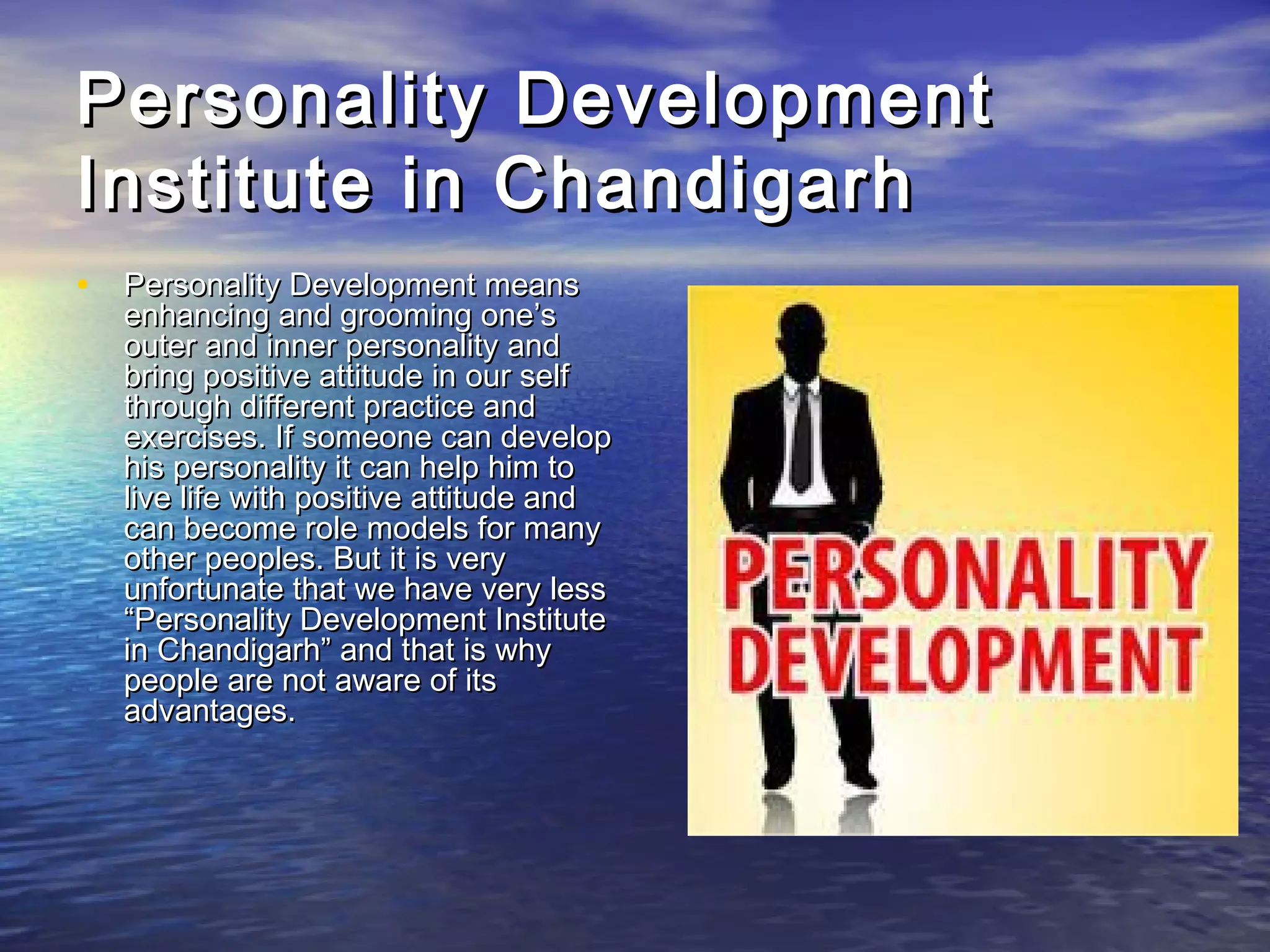 The document discusses the significance of personality development, emphasizing the enhancement of both outer and inner personalities to foster a positive attitude through various practices. It highlights the limited presence of personality development institutes in Chandigarh and the benefits of such programs, including improved self-motivation, stress management, and effective communication. The institute offers flexible courses ranging from three months to one year, taught by experienced teachers with opportunities for individual interaction and group discussions.