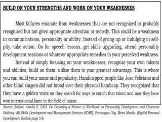 The document discusses the importance of self-knowledge and personality development during adolescence, highlighting how understanding one's strengths and weaknesses can improve decision-making and personal growth. It provides various tips for enhancing capabilities, managing relationships, and overcoming worry, emphasizing the significance of positive attitudes and effective communication. Additionally, it contrasts the traits of successful individuals with those who are less successful, underscoring the value of hard work, determination, and self-confidence.