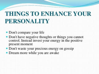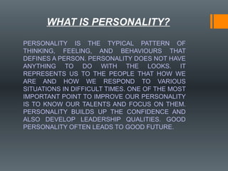 The document discusses the importance of personality development, defining personality as the pattern of thoughts, feelings, and behaviors that represent an individual. It outlines key traits of a good personality, methods for improvement through education, respect, and good manners, and emphasizes the role of self-awareness and social insights. The overall aim is to cultivate desirable attitudes and skills that contribute to personal and professional success.