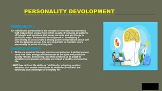 The document discusses personality development and life skills. It states that an individual's unique personality is shaped by factors like heredity, environment, education, experiences, and values. It also defines life skills as abilities that enable people to effectively handle daily demands and challenges. There are 10 core life skills discussed, including self-awareness, problem solving, decision making, communication, and coping with stress. The document suggests that developing these life skills can help enhance one's personality.