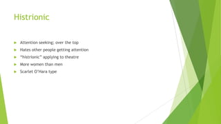 This document describes several personality disorders: histrionic personality disorder is characterized by attention seeking behavior and dislike of others receiving attention; narcissistic personality disorder involves an excessive focus on oneself, one's appearance, and accomplishments; antisocial personality disorder is defined by a disregard for laws and social norms, lack of empathy, and manipulation of others; borderline personality disorder includes unstable relationships, anger, and feelings of emptiness; and passive-aggressive personality disorder involves passive expression of aggression such as chronic lateness or failure to complete tasks.
