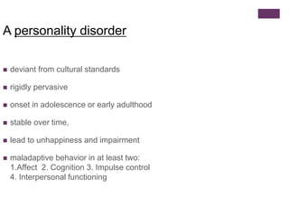 This document provides an overview of personality disorders, including their defining characteristics, diagnostic criteria, prevalence, and treatment approaches. Personality disorders are characterized by inflexible and maladaptive patterns of behavior that cause distress or impairment. They are divided into three clusters (A, B, and C) based on clinical characteristics. Borderline personality disorder is one of the most common personality disorders and is defined by instability in interpersonal relationships, self-image, and affect. Treatment focuses on establishing therapeutic alliances, managing crises, education, and therapies like dialectical behavior therapy that target affect regulation and adaptive coping skills.
