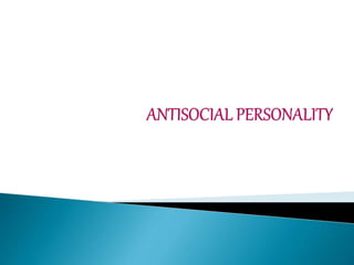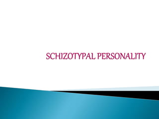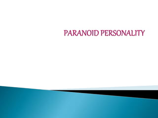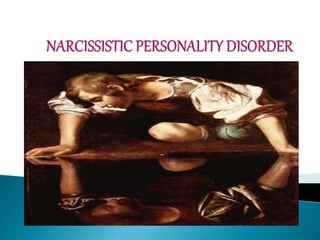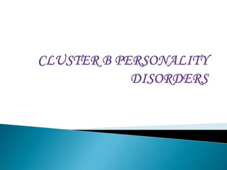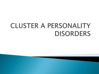 This document discusses personality disorders. It begins by defining personality and personality traits, then defines personality disorders as inflexible and maladaptive personality traits that interfere with functioning. It describes three clusters of personality disorders - Cluster A which includes odd or eccentric behavior; Cluster B which includes dramatic, emotional or erratic behavior; and Cluster C which includes anxious or fearful behavior. The document then provides more details on specific personality disorders like paranoid, schizoid, schizotypal, antisocial, borderline, histrionic and narcissistic personality disorders. It discusses symptoms, causes, treatment options for each.