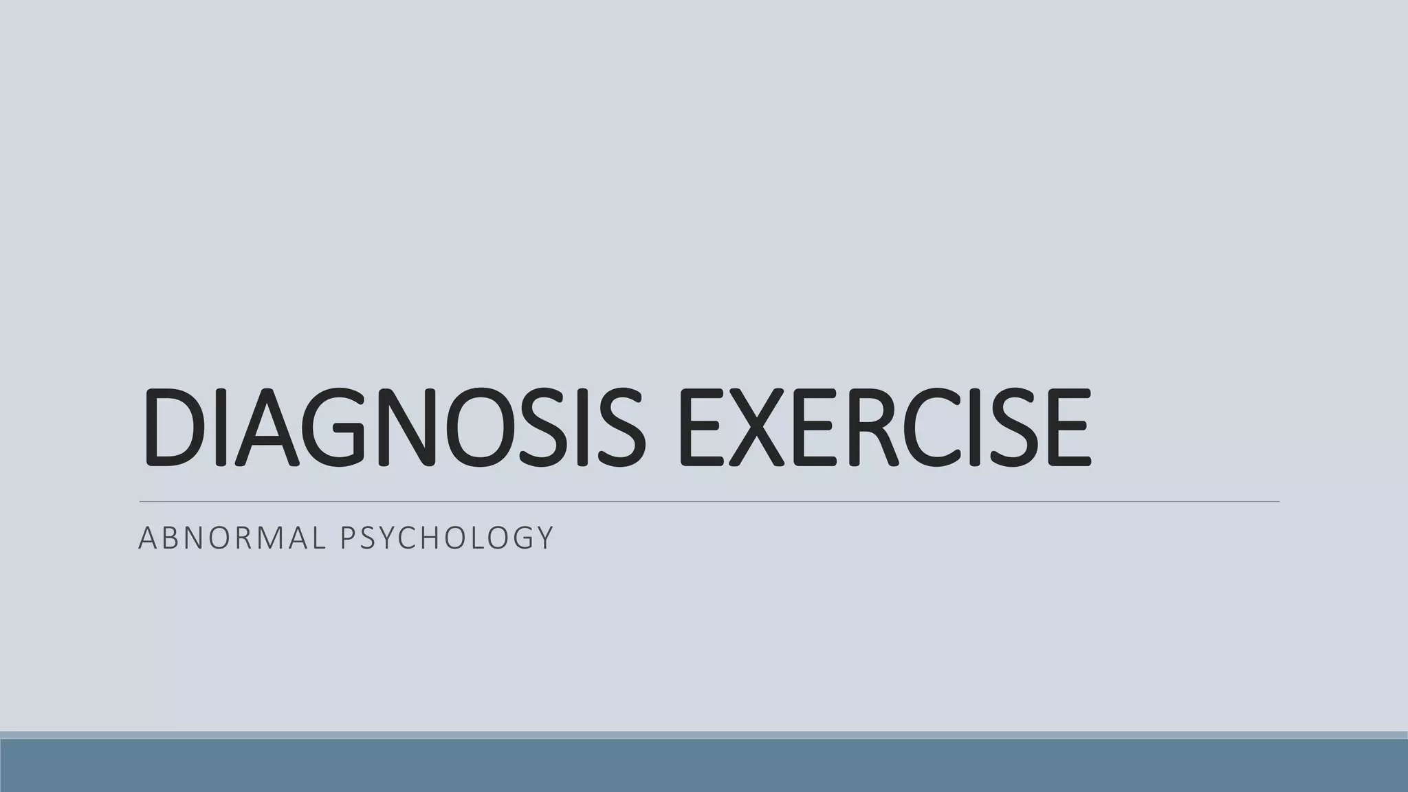 This document provides instructions for an abnormal psychology exercise where students will read case studies describing individuals' behaviors and independently diagnose their potential mental illnesses. It includes 8 case studies describing people exhibiting various problematic behaviors and symptoms. Students are asked to diagnose each case with a mental illness based on their training. An answer key is provided with the instructor's diagnosis for each case.