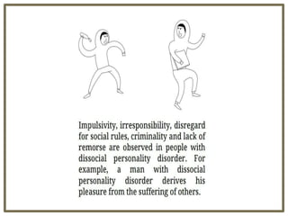 Personality disorders are characterized by extreme and inflexible patterns of thinking and behaving. Antisocial personality disorder is characterized by a disregard for others and a pattern of violating the rights of others. It has a prevalence of 0.6-3.0% in the community and is more common in men. Risk factors include childhood experiences like abuse, inconsistent parenting, and a temperament prone to aggression and low self-control. Individuals with antisocial personality disorder often break laws and social norms through behaviors like manipulation, deceitfulness, and lack of remorse.