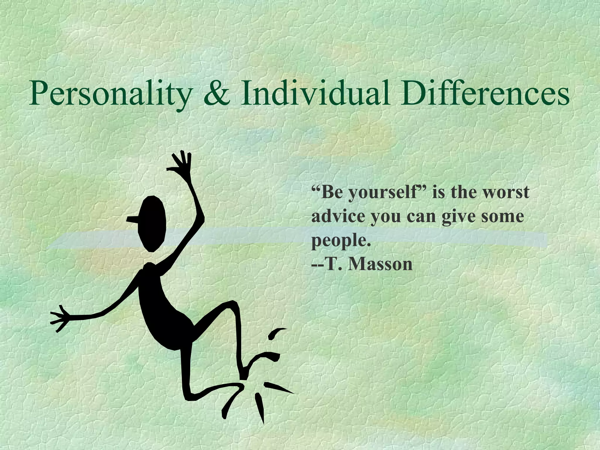 This document discusses personality and individual differences that are important for managers to understand. It defines key concepts like the Big Five personality traits, emotional intelligence, locus of control, and Holland's personality-job fit theory. Understanding these differences can help managers create good fits between employees' personalities and their jobs to increase performance, satisfaction and retention. The document advises managers to consider individuals' personalities when providing supervision, support, feedback and setting expectations.