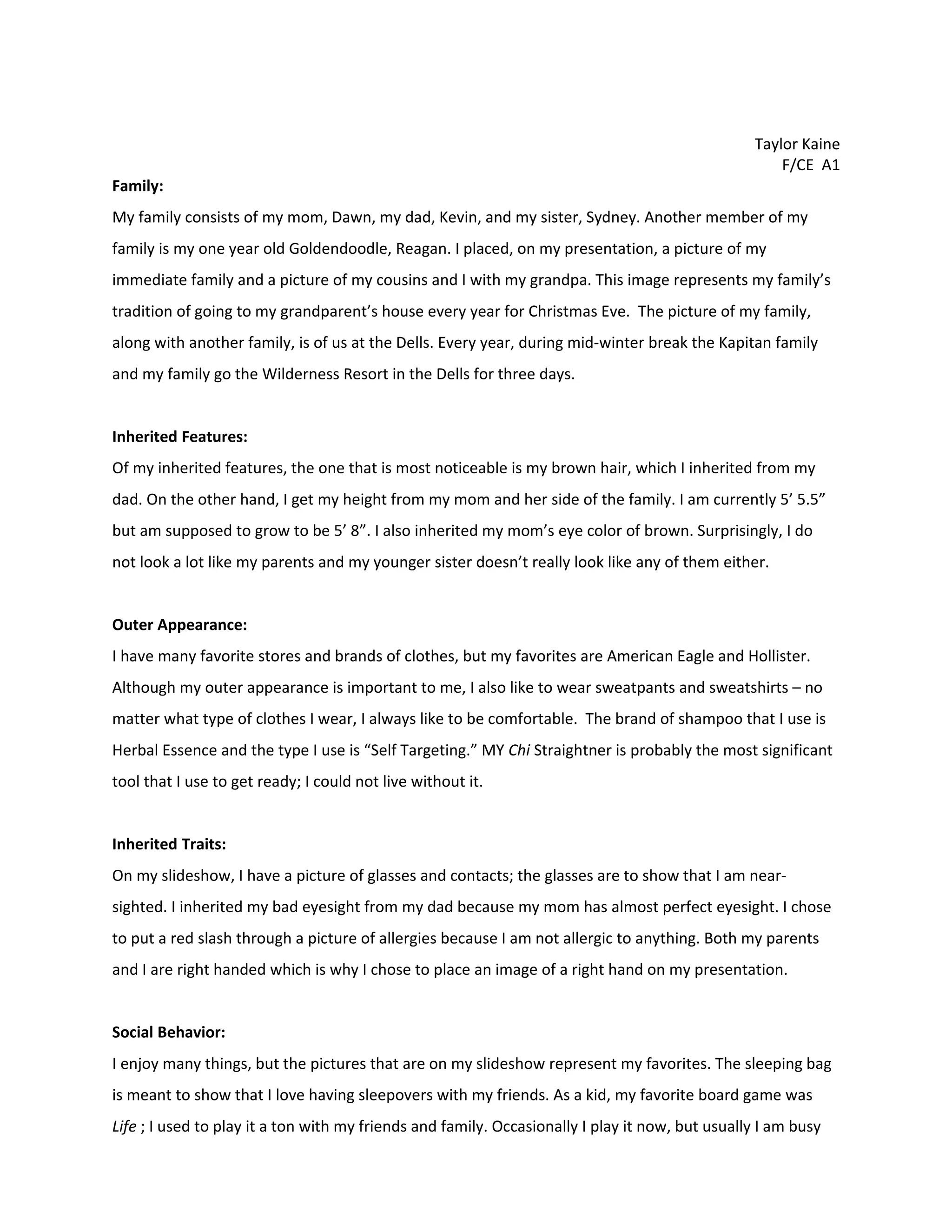 1) The document is a presentation about Taylor Kaine created for a school project. It describes her family, physical appearance, inherited traits, hobbies, future plans, likes/dislikes and life experiences.