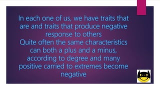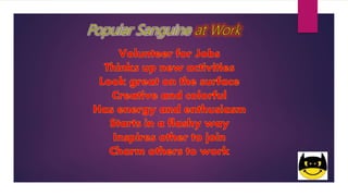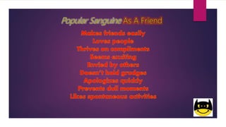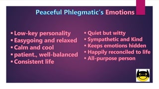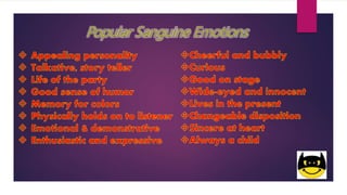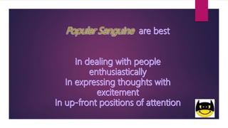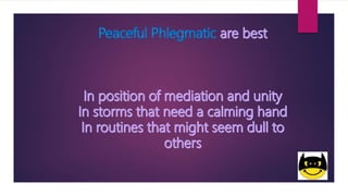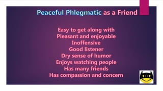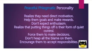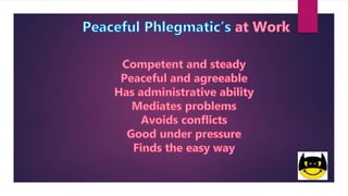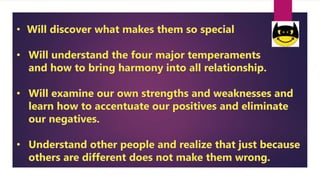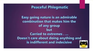 The document contains descriptions of various personality types and temperament blends. It discusses the key traits of different temperaments such as choleric, sanguine, phlegmatic and melancholic. It also outlines 15 common temperament blends, describing what each blend is like at work, as parents and friends. The blends include executive, motivator, director, strategist, negotiator, marketer, relater, performer, inspector, harmonizer, and helper.