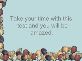 This document presents a personality test consisting of 4 questions with interpretations of the answers. The questions ask you to rank 5 animals in order of preference, describe 5 items with one word each, relate 5 colors to important people, and provide a favorite number and day of the week. It claims the answers will reveal priorities, personality, and relationships. It warns to be honest and not look up answers.