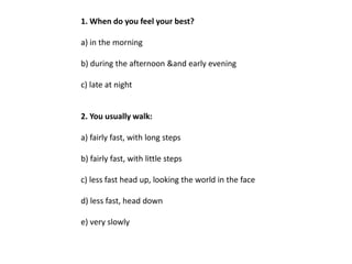 This personality test consists of 10 multiple choice questions about behaviors and preferences. Respondents are instructed to answer based on who they are now, not in the past. The test is used by human relations departments in major corporations to better understand employees. Scores are then categorized into ranges, with descriptions of how others may perceive someone at each scoring level, from over 60 points where one is seen as very dominant to under 21 points where one is seen as shy and indecisive.
