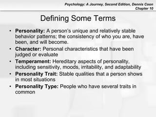 This document summarizes key concepts from Chapter 10 of the textbook "Psychology: A Journey" regarding personality theories. It defines personality as stable behavior patterns that make up a person's identity. It describes several approaches to understanding personality, including trait theories, psychodynamic theories, behaviorist theories, social learning theories, and humanistic theories. It provides overviews of several major theorists' concepts, such as Freud's psychodynamic theory including the id, ego, and superego, and humanistic psychologists like Maslow who focused on self-actualization. It also summarizes the "Big Five" model of personality traits.