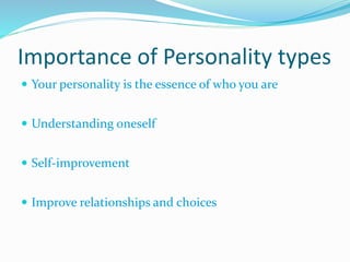 This document discusses different personality type frameworks including Myers-Briggs, stress personality types, Type A/B personalities, Big 5, and Sheldon's somatotypes. It notes that understanding personality types can provide benefits like self-improvement, better relationships, career coaching, and using strengths. The Myers-Briggs framework categorizes personalities along dimensions of extraversion/introversion, sensing/intuition, thinking/feeling, and judging/perceiving. Understanding types can aid leadership development, team building, and sales training.