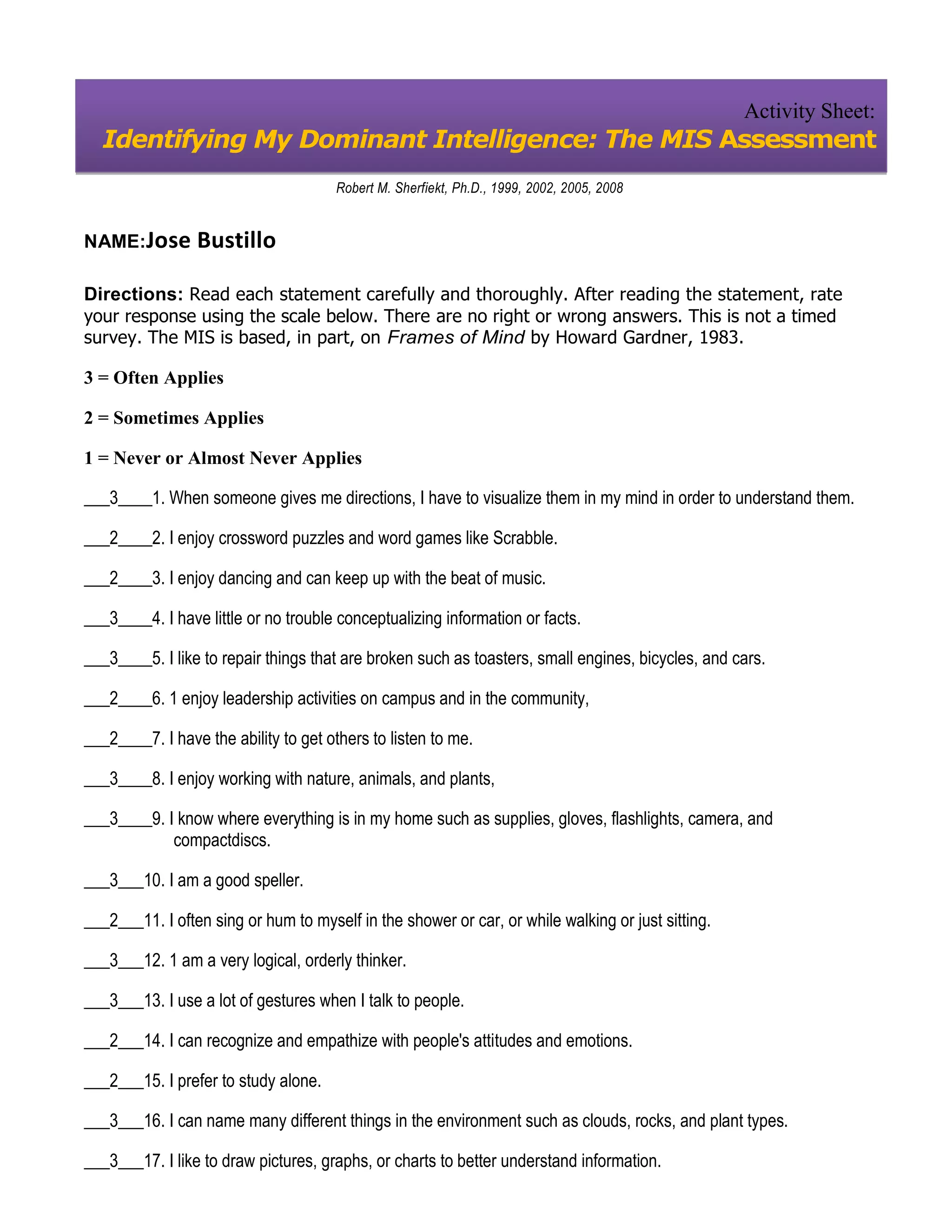 This document is an activity sheet for identifying dominant intelligences based on the Multiple Intelligences theory. It contains a 40 question self-assessment where participants rate themselves on a scale from 1 to 3. Their responses are then tallied in different categories associated with specific intelligences. The participant's top three intelligence categories are identified as Visual/Spatial, Naturalistic, and a three-way tie between Verbal/Linguistic, Logic/Math, and Interpersonal. The sheet provides insight into their strengths but is not intended as a definitive assessment of abilities.
