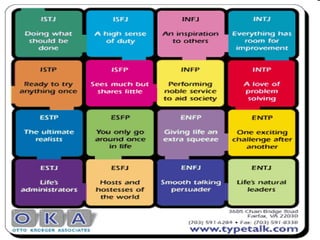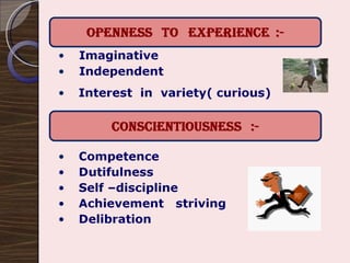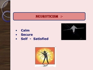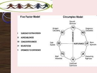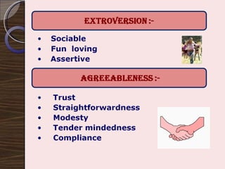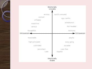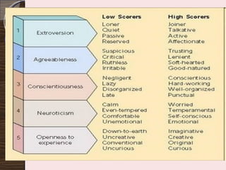 The document discusses the relationship between personality, behavior, and values in the workplace, emphasizing that understanding an individual's personality can provide insights into their work-related behaviors. It outlines various personality theories, including the Myers-Briggs Type Indicator and the Big Five personality traits, and describes how these traits can influence job performance and employee satisfaction. Additionally, it explores the role of values in shaping attitudes and motivations, asserting that alignment between employee values and organizational values is crucial for optimal performance.