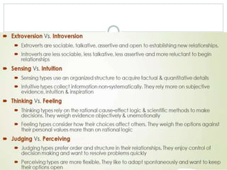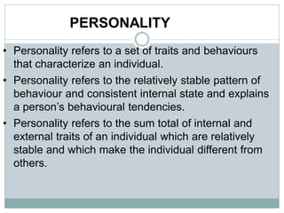 Personality refers to the combination of behaviors, emotions, motivations, and thought patterns that characterize an individual. It is shaped by both hereditary and environmental factors like family, culture, and social interactions. Major theories of personality development include Freud's psychosexual stages, Erikson's psychosocial stages, and the Big Five model which describes personality in terms of openness, conscientiousness, extraversion, agreeableness, and neuroticism. Personality attributes like locus of control, self-esteem, and risk-taking influence how individuals behave in different situations. Personality testing tools like Myers-Briggs can provide insight into personality types.