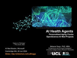 The document outlines the AI Health Agents system, which aims to provide personalized healthcare through advanced technologies like math agents and digital twins, facilitating proactive health management rather than reactive care. It emphasizes the integration of quantum computing, blockchain, and generative AI to enhance healthcare delivery, address aging as a pathology, and promote health equity. Key features discussed include personalized aging clocks, health monitoring through mobile applications, and the use of AI for developing novel health treatments and interventions.