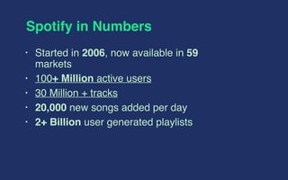 Spotify uses various machine learning models to power personalized playlist and track recommendations for its over 100 million active users. Latent factor models represent users and songs as vectors in a shared dimensional space to predict listener preferences. Deep learning models analyze audio features to learn song representations. Natural language processing models like Word2Vec represent user listening histories as sequences to predict future interests. While current models are effective, future work includes incorporating more contextual data into embeddings to remove biases and better capture long-term user intents.