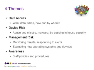 The document discusses key themes and considerations for organizations regarding employees using personal devices for work. It covers issues around data access, device risks, management risks, and staff awareness. Specific topics examined include corporate and personal liability, digital evidence, monitoring communications, data protection, and implementing appropriate policies to address these issues. The goal is to help businesses balance enabling innovation through new technologies while managing risks.