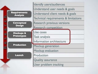 This document discusses user research methods like personas, scenarios, use cases, and hierarchical task analysis used to understand users and define requirements. It explains that personas are composite profiles representing user groups, scenarios are stories of persona interactions, use cases describe task steps, and hierarchical task analysis breaks tasks into subtasks. The goal is to design for specific user needs through techniques like interviews, surveys and focus groups to analyze data and create personas, scenarios and requirements.