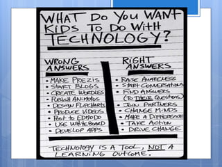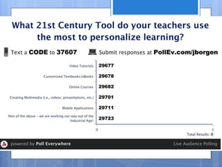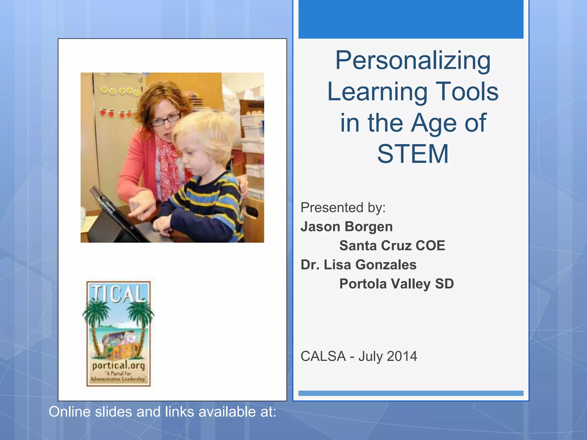 This document summarizes a presentation about personalizing learning tools in STEM education. The presentation explored how to use web2.0 tools to personalize learning, integrate STEM-related tools that support flexible learning, and create a model classroom pilot program that can then be scaled up. It also discussed potential challenges in implementing such programs and strategies to overcome them. Examples of specific tools mentioned include Khan Academy, Code.org, EduCreations, and multimedia apps for student project creation and assessment.