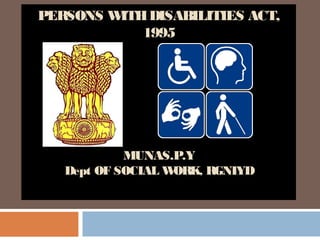 The document discusses the Persons with Disabilities Act of 1995 in India. It defines disability as including both mental and physical conditions. It notes that according to the 2001 Census, there were over 2 crore people with disabilities in India, mostly living in rural areas. The act aims to prevent disabilities, protect the rights of persons with disabilities, and promote their inclusion and equal access to areas like education, employment, and public spaces. It requires governments to reserve 3% of positions in public sector for persons with disabilities and outlines accommodations to promote accessibility.