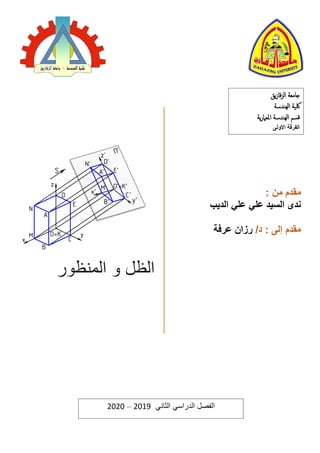تتناول الوثيقة موضوع المنظور في الفن والهندسة، بدءًا من تعريفه وأنواعه، إلى تقنيات استخدامه مثل المنظور الهندسي والفوتوغرافي. كما تستعرض أهمية المنظور في التصميم المعماري وإظهار الأشكال المجسمة. تشمل الوثيقة أيضًا تجارب تاريخية واستخدامات عملية للمنظور في الرسوم والتصاميم.