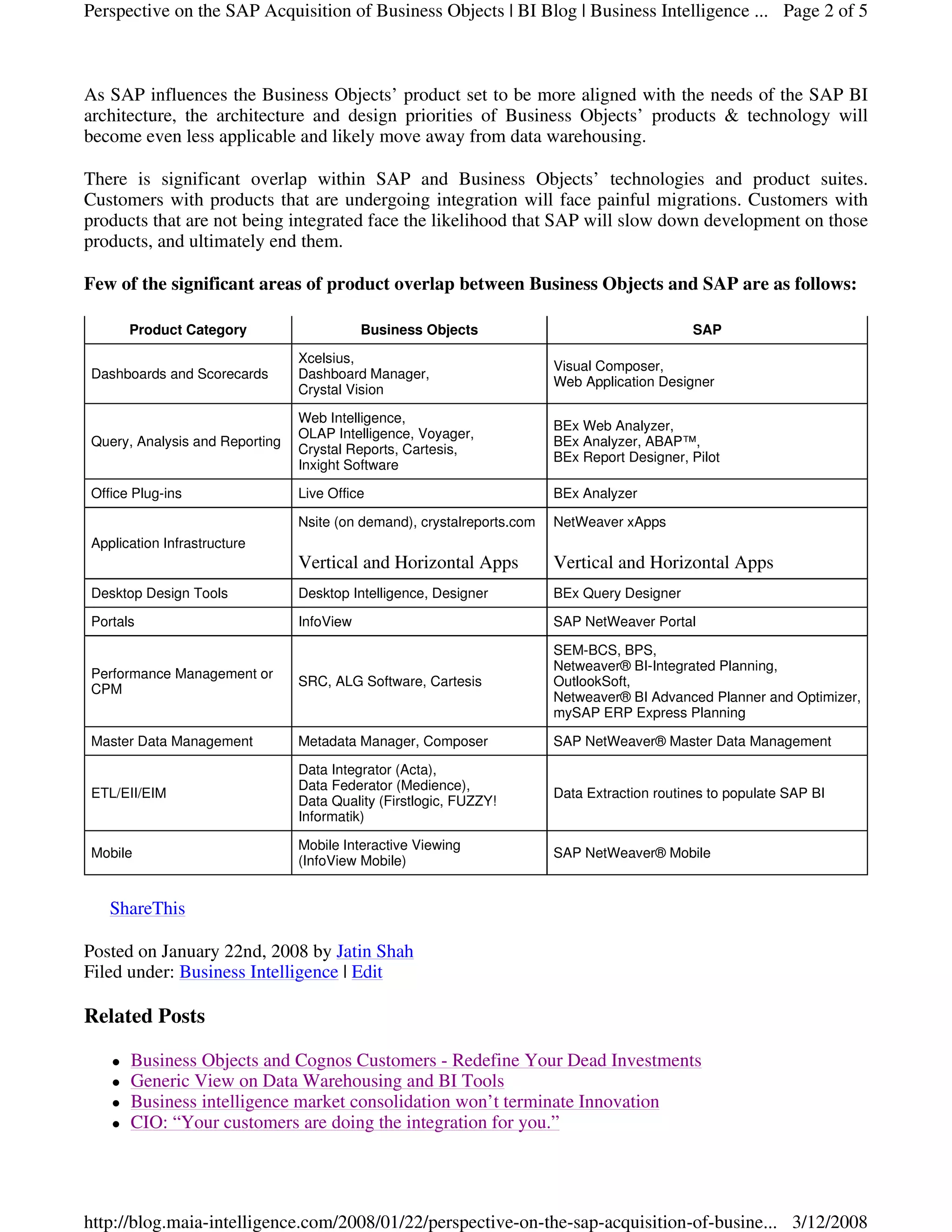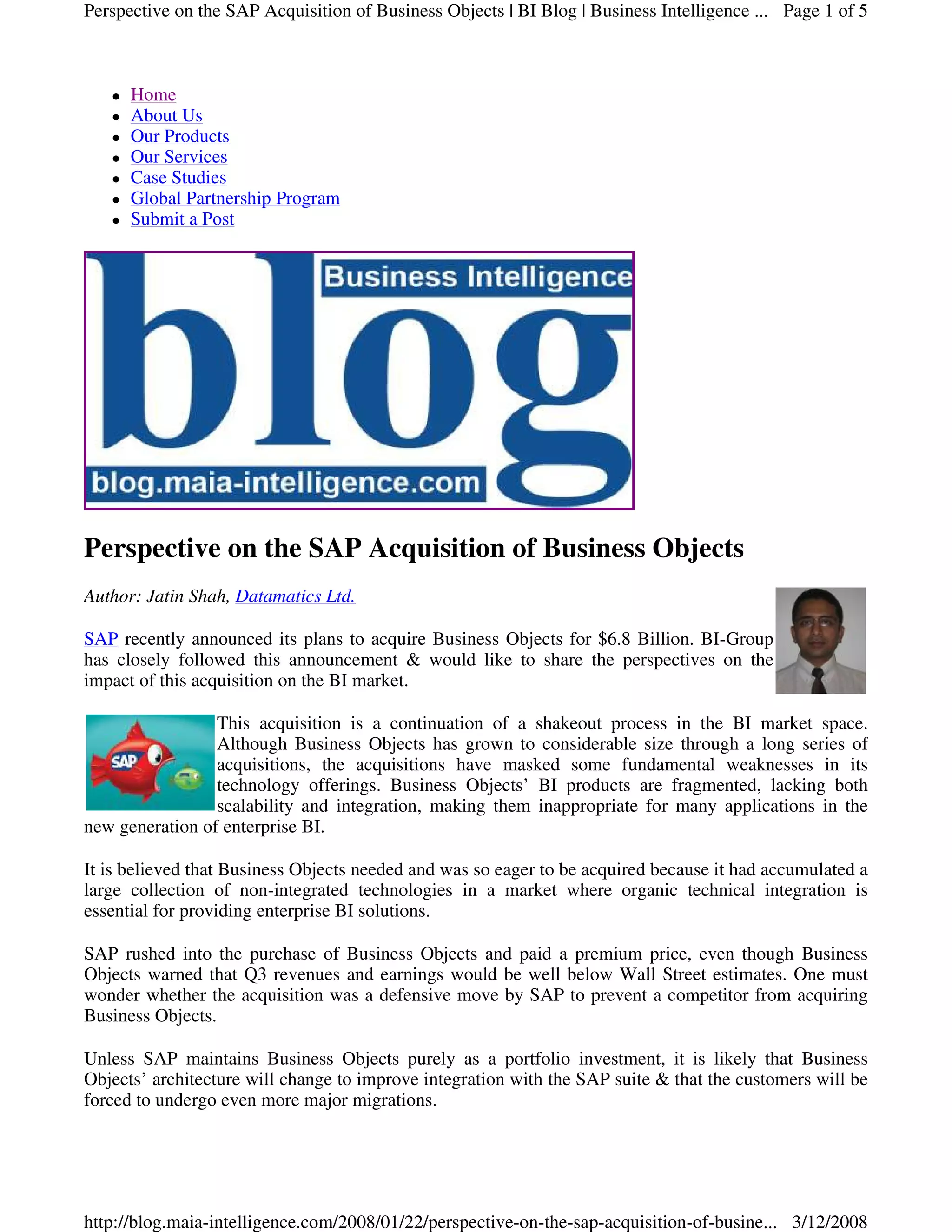The document discusses the perspectives on SAP's acquisition of Business Objects for $6.8 billion. It states that the acquisition was likely a defensive move by SAP to prevent another competitor from acquiring Business Objects. There is significant product overlap between the two companies, which may lead customers to face painful migrations. Unless SAP maintains Business Objects as a portfolio investment, its architecture will likely change to better integrate with SAP and customers may need to undergo major migrations.