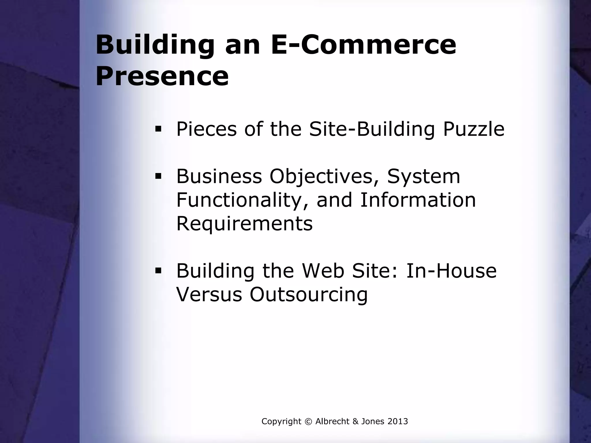 This document discusses building an e-commerce presence and outlines three main sections: pieces of the site-building puzzle; business objectives, system functionality, and information requirements; and building the web site through either in-house development or outsourcing.