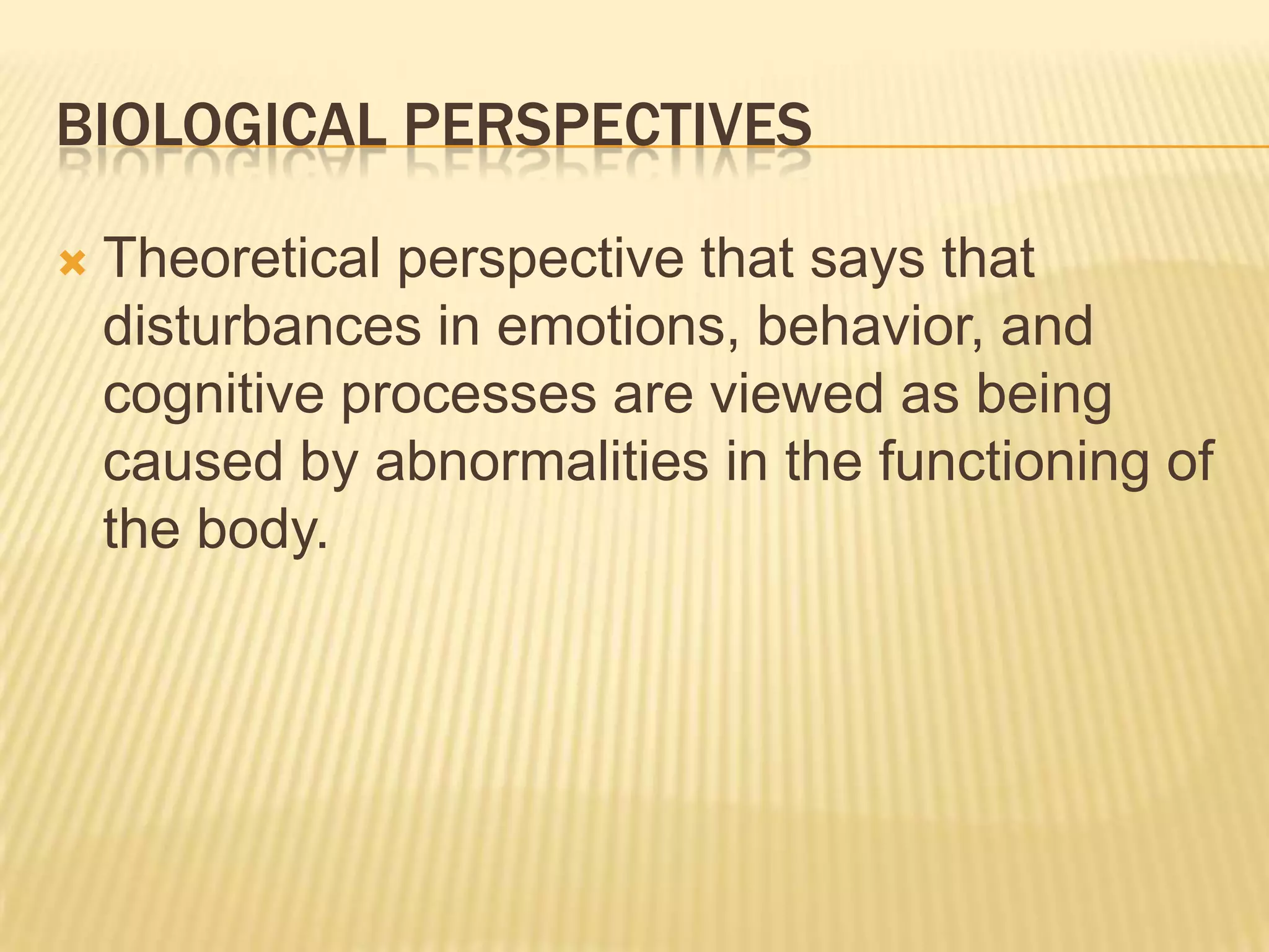 The document outlines four major perspectives in psychology: the biological perspective views psychological disorders as caused by abnormalities in bodily functioning; the psychodynamic perspective emphasizes unconscious forces and resolving inner conflicts; the behavioral perspective focuses on how behavior is learned through rewards and punishments; and the cognitive perspective sees psychological disorders as products of disturbed thoughts that can be changed by altering thought patterns.