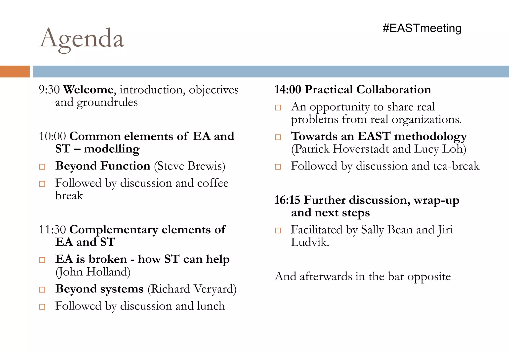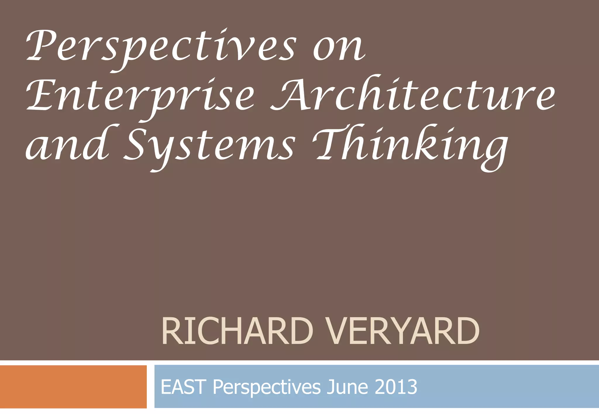 The document discusses the relationship between enterprise architecture (EA) and systems thinking (ST). It explores whether they are the same thing or different, and what they can learn from each other. The document raises questions about their common elements and differences, including different notions of "system", purposes, and practices. It also discusses opportunities for collaboration between EA and ST practitioners to address complex problems. The overall tone is one of open inquiry rather than assertions, seeking to have a thoughtful discussion around the topics.
