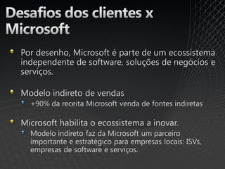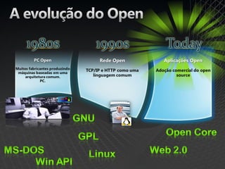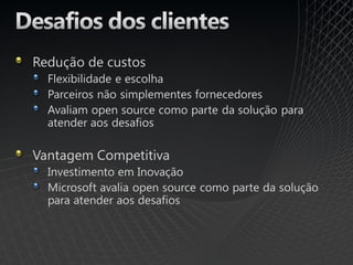 This document discusses Microsoft's "Open Edge" strategy of combining open source software (OSS) with their commercial core products. It lists several ways Microsoft incorporates OSS, such as supporting PHP on IIS, jQuery in Visual Studio, OpenPegasus for System Center, and over 300 OSS components in SharePoint. It also discusses Microsoft contributions to OSS projects like Linux kernel drivers for Hyper-V, AMQP protocol support in Apache Qpid, and integrations with Moodle and Chem4Word. The strategy aims to provide customers choice and flexibility through an open hybrid environment.