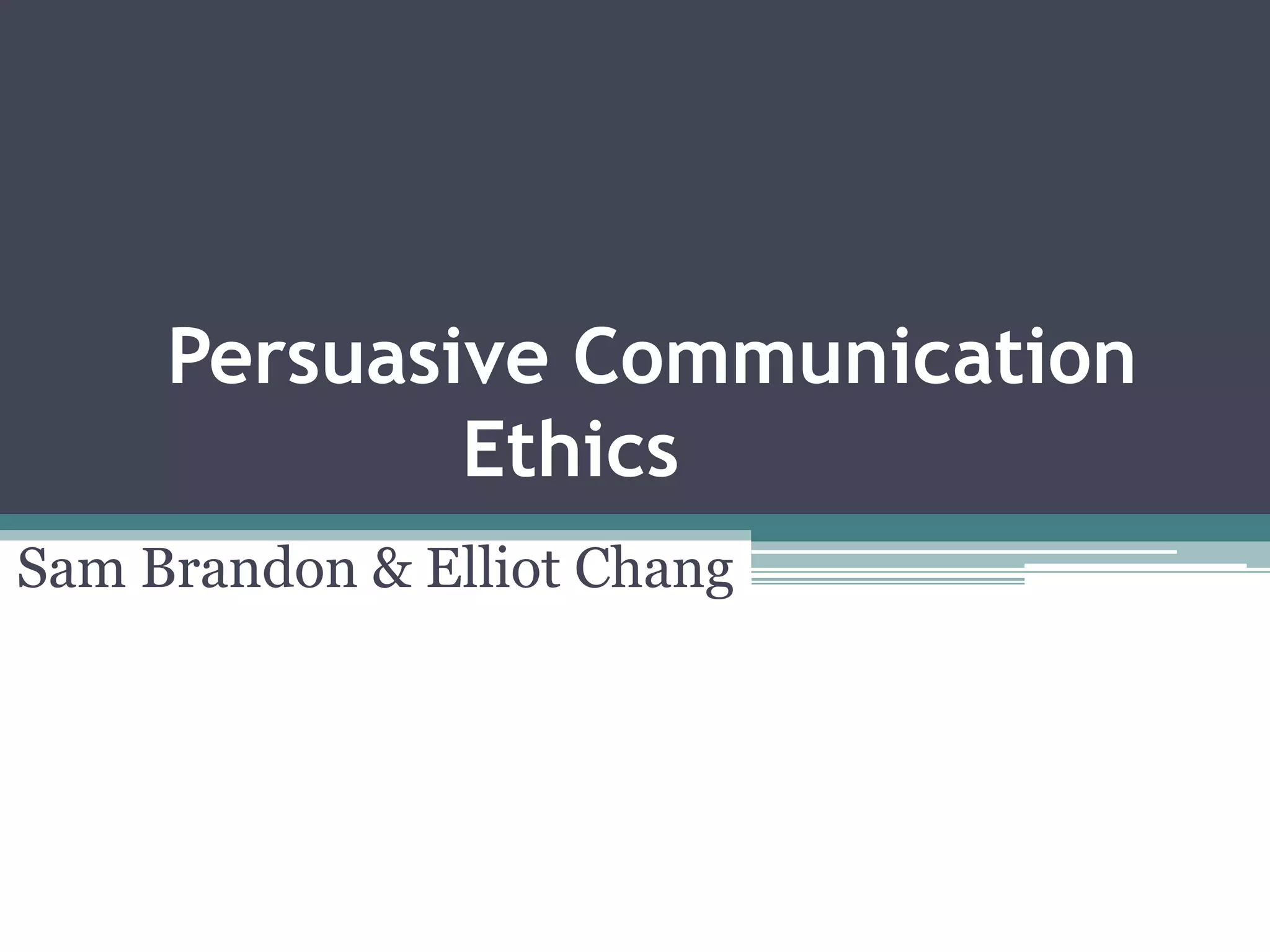 The document discusses the ethics of persuasive communication, particularly in the context of public relations (PR) and propaganda, highlighting the blurred lines between the two. It emphasizes the importance of truthfulness, integrity, and ethical decision-making principles in PR practices while exploring the historical background of propaganda's influence on public opinion. The document addresses the debate on whether PR constitutes soft propaganda and outlines ethical frameworks for distinguishing ethical persuasion from manipulative practices.