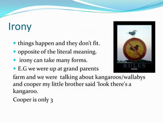 The document discusses various persuasive devices that can be used in deep thinking including: irony, hyperbole/exaggeration, clichés, satire, repetition, rhetorical language techniques, and anecdotes. It provides examples and definitions for each device to illustrate how they can be employed persuasively. Rhetorical language techniques include rhetorical questions, emotive language, parallel structures, sound patterns, contrast, description/imagery, and the rule of three. Anecdotes are also discussed as engaging the reader through relatable stories.