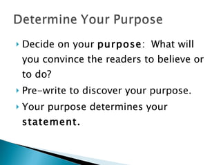This document provides guidance on writing an essay to convince others of an opinion. It recommends choosing a clear purpose and intended audience. The introduction should capture attention with a hook, then state the thesis. Main points should be presented in paragraphs with topic sentences and supporting examples. Transitions should link arguments. A conclusion should restate the thesis and leave the reader thinking with a memorable final sentence.