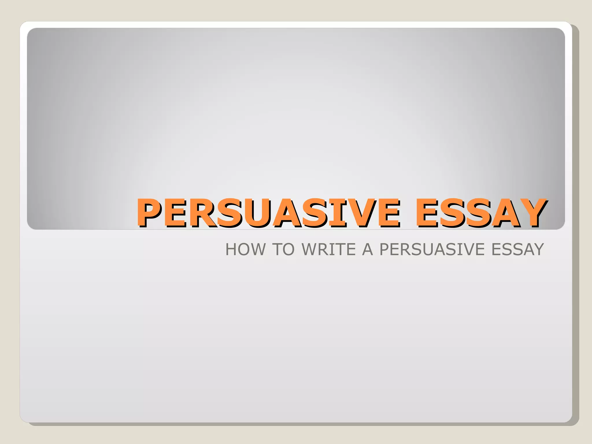 A persuasive essay attempts to convince the reader of a particular viewpoint using sound reasoning and evidence. It follows several key steps: choosing a clear position on an issue, researching the topic thoroughly through various sources to find specific evidence, and structuring the essay to present the evidence in a logical order. A strong persuasive essay will be well-informed, have a debatable thesis, disprove opposing arguments, and support its position using facts, statistics, expert quotes, and concrete examples from responsible sources.