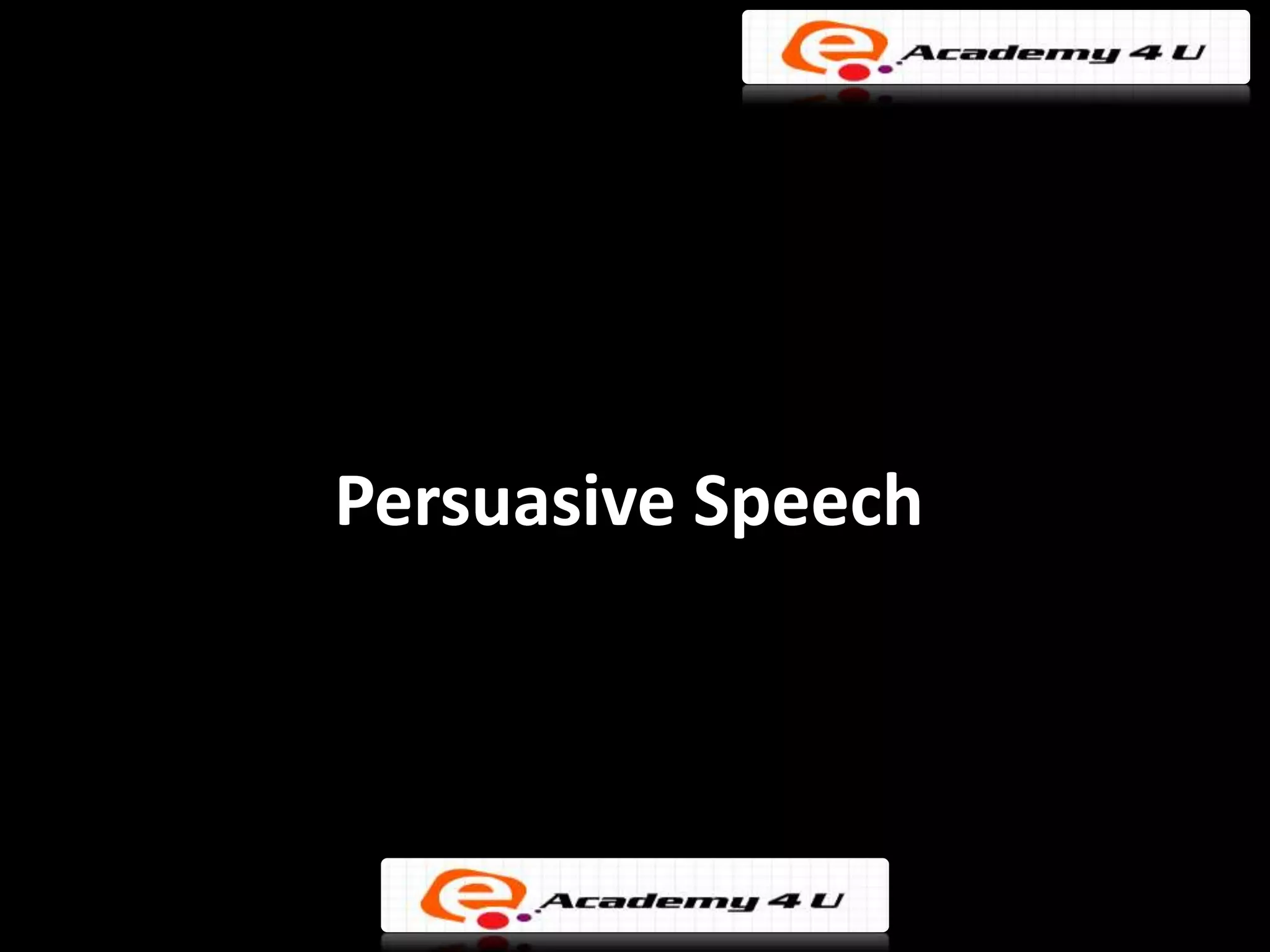 This document provides guidance on delivering an effective persuasive speech. It explains that the goal of a persuasive speech is to influence the audience to accept the speaker's idea, attitude, or proposed action through argumentation, rationalization, and supporting information. It outlines the key components of a persuasive speech, including the introduction where the speaker introduces the topic and their position, the body where the speaker justifies their position with facts and examples, and the conclusion where the speaker leaves a strong, lasting impression. It also provides tips for an engaging delivery through proper body language, articulation, pitch, speed, pauses, volume, and pronunciation.
