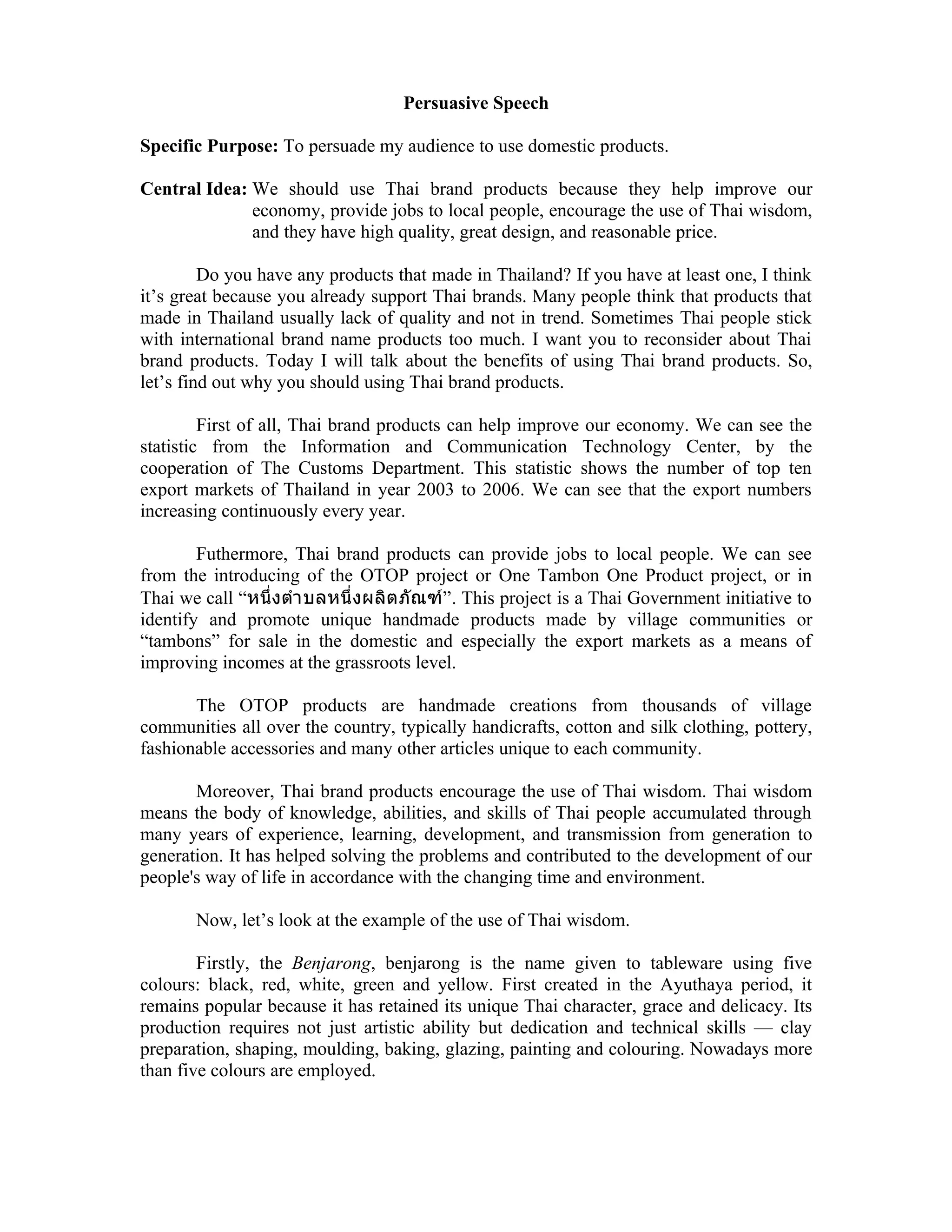 The speaker argues that audiences should use Thai brand products for several reasons: