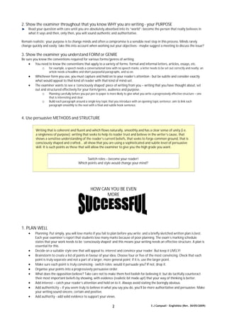 This document provides guidance on writing to persuade for GCSE English exams. It discusses the key aspects of persuasive writing, including understanding the audience and their perspective, establishing a clear purpose, and using an appropriate structure and persuasive methods. The document emphasizes planning effectively, catching the reader's attention, acknowledging other viewpoints tactfully, supporting arguments with evidence, and crafting the writing in a sincere, authoritative tone. Overall, the document outlines techniques for developing a well-structured, audience-focused persuasive piece.