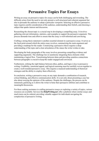 The document discusses the process and challenges of writing persuasive essays, emphasizing the importance of topic selection, research, and crafting a strong thesis statement. It highlights the need for effective communication through evidence and rhetorical strategies to sway the audience's opinions. Additionally, it addresses the challenges of persuasive writing while noting the personal growth it can facilitate for the writer.